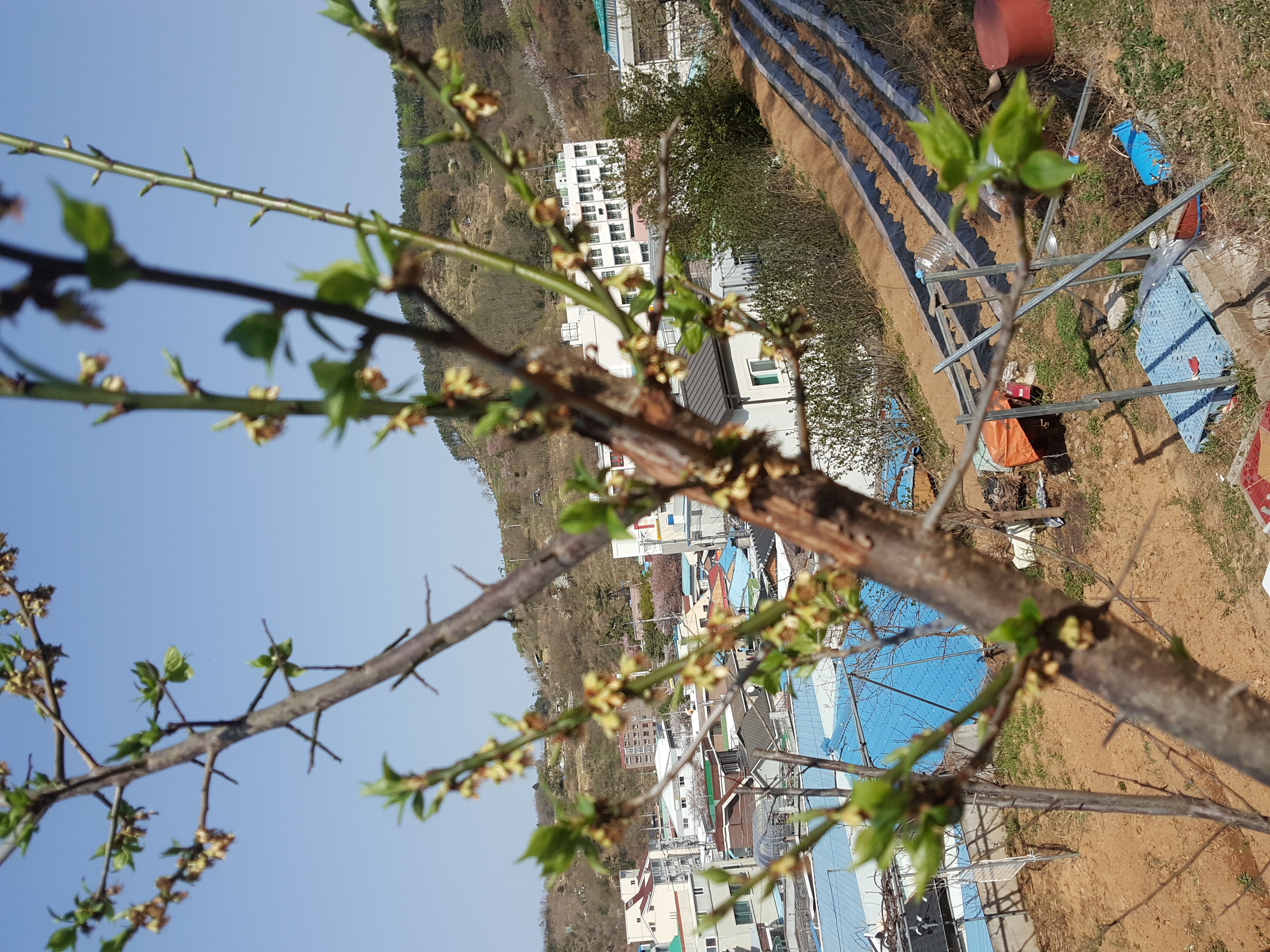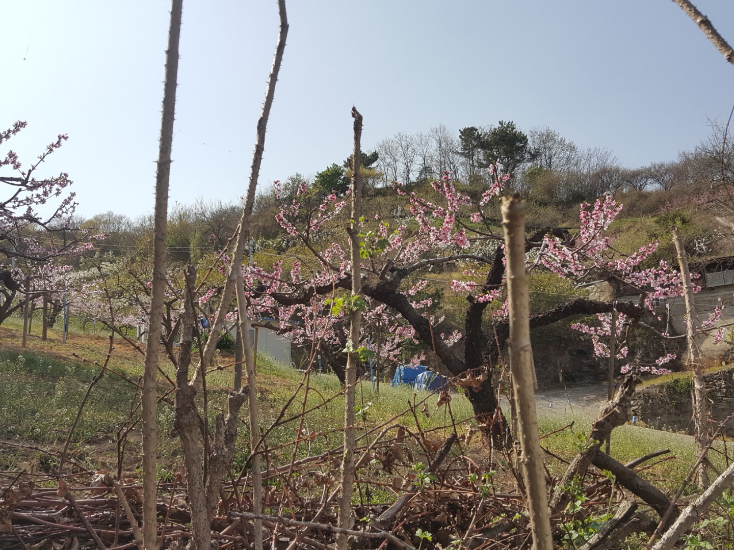 두룹나무와 복숭아 나무에 꽃이 핀 풍경